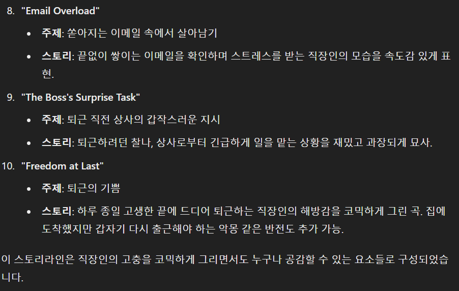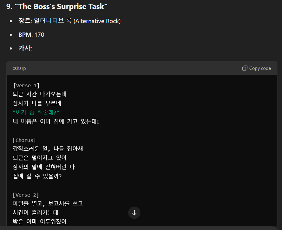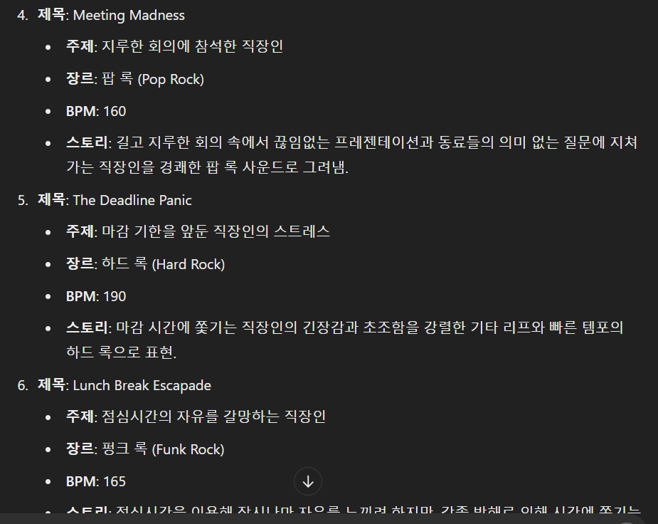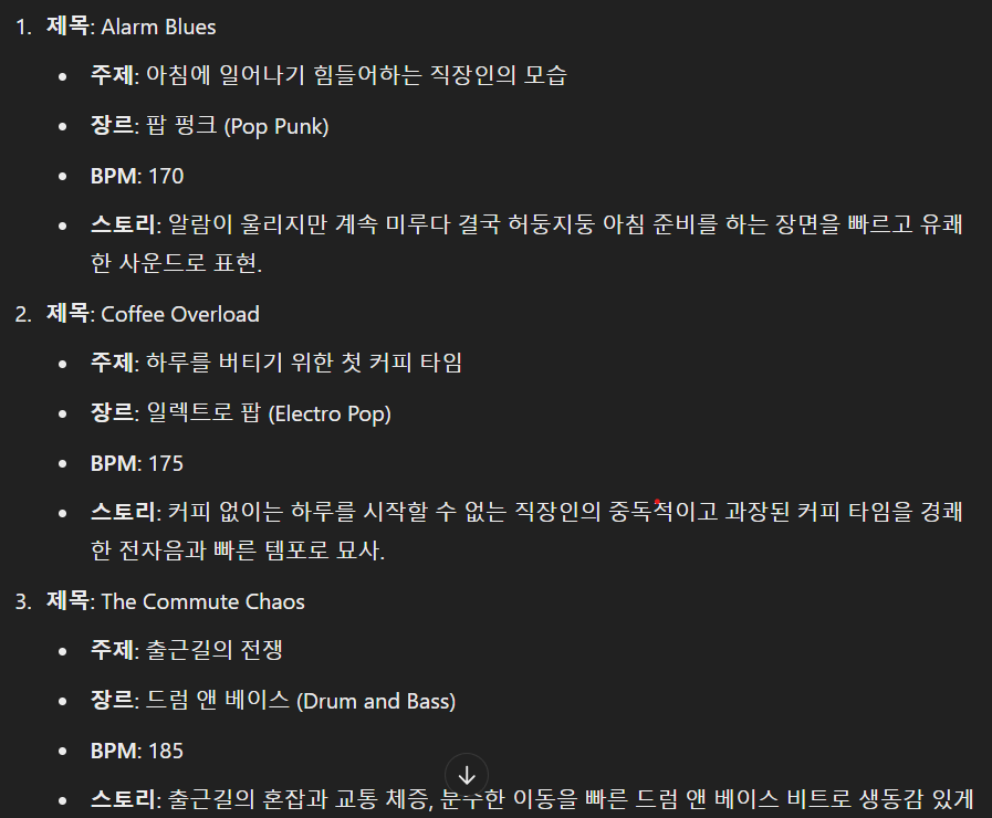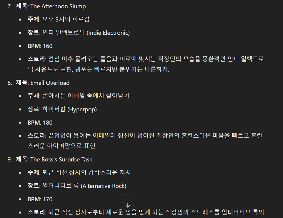 결과를 보면 좀 재미난 곡들 나올 것 같습니다.!!~ 기대되네요. 제 ChatGPT는 지난 오랜 기간 동안 저와 함께 하면서 저에게 최적화가 되어 있기에 여러분들 화면에는 좀 다르게 나올 수도 있습니다. 참고하세요.