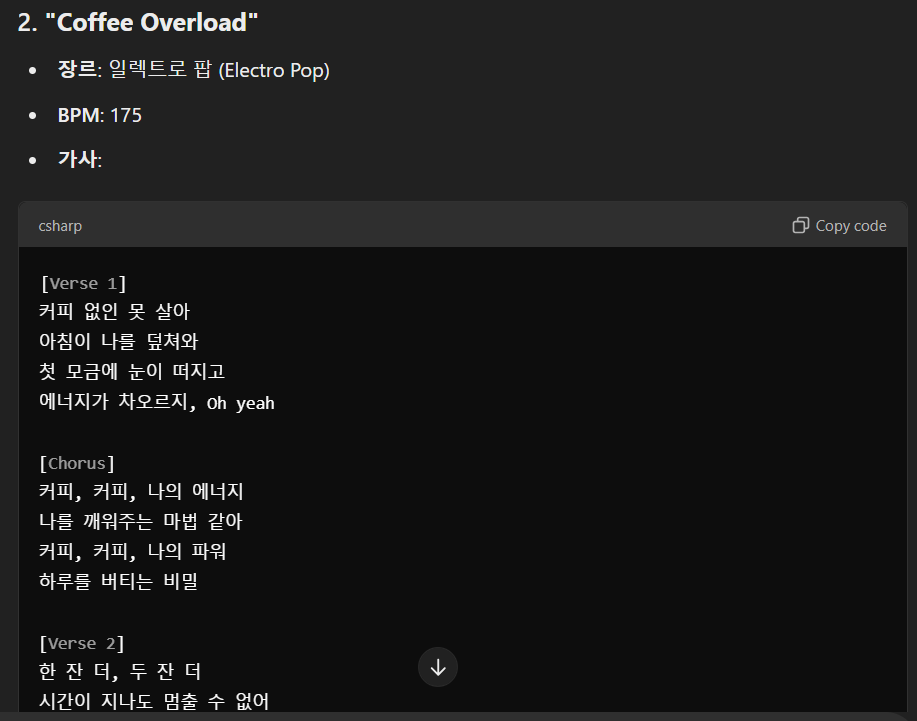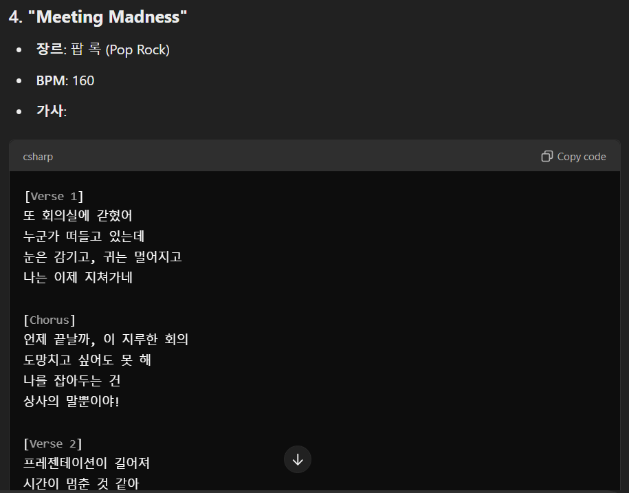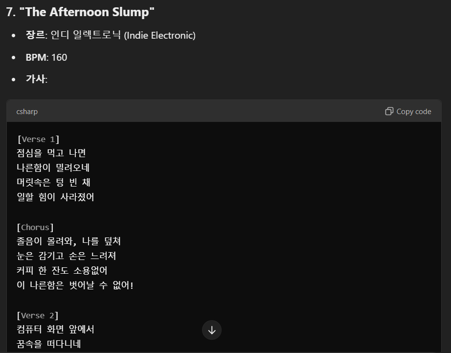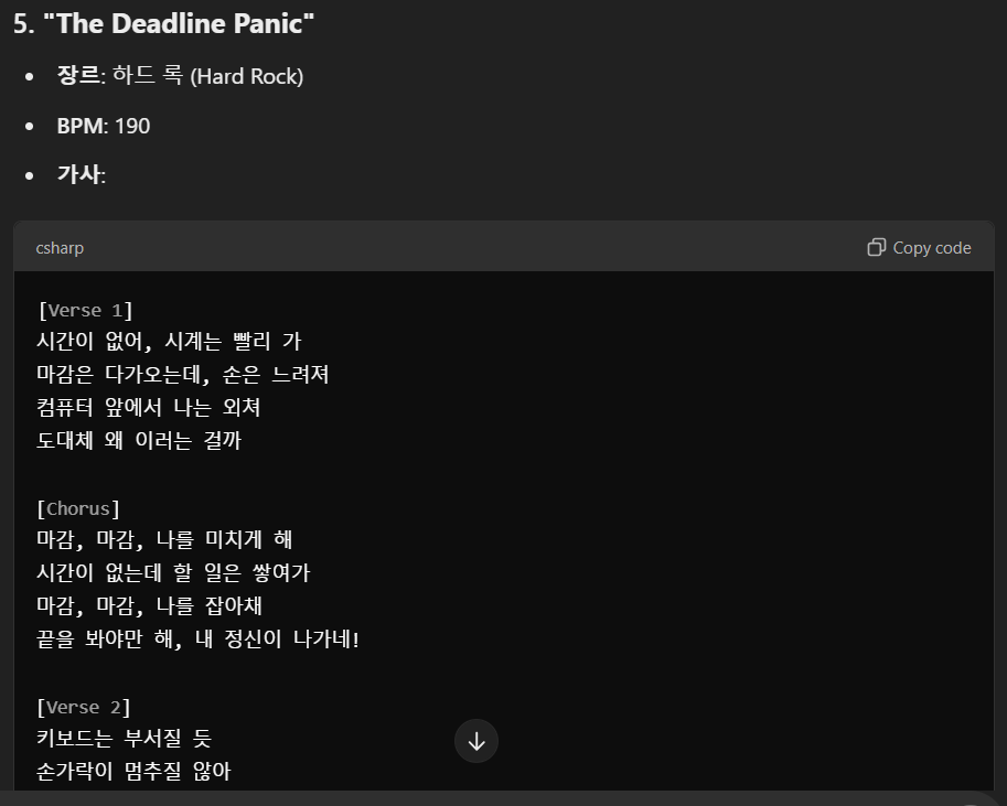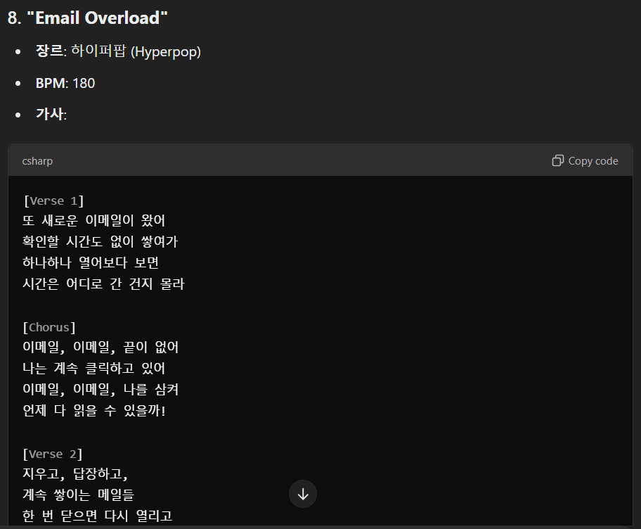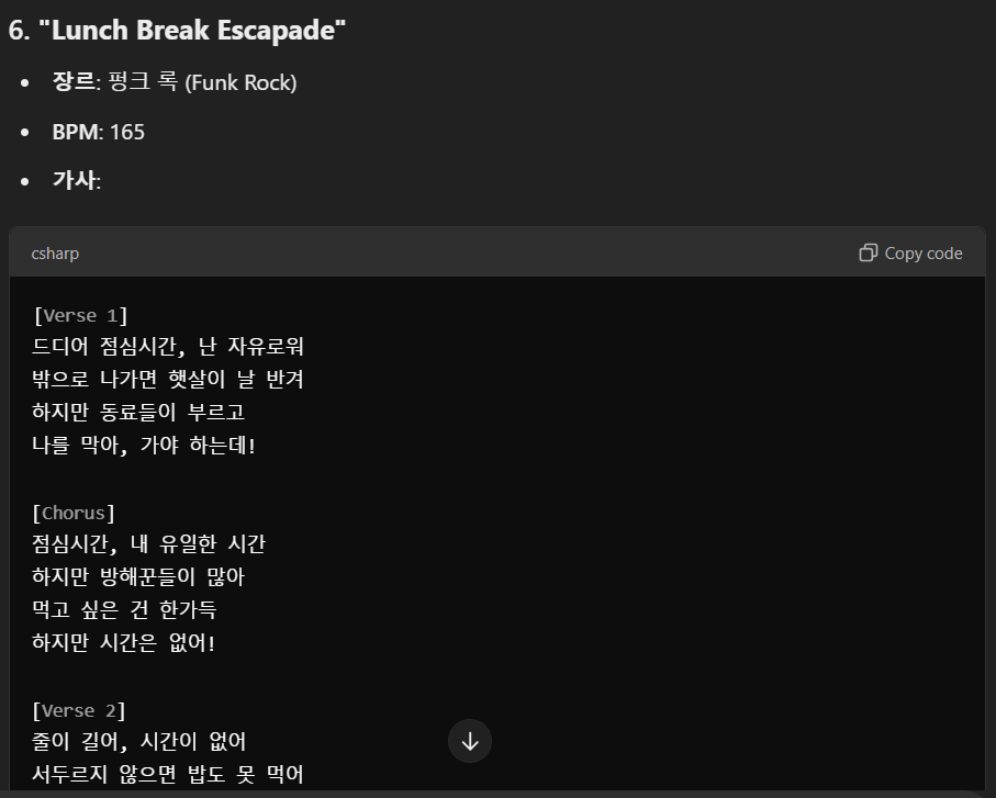 결과를 보면 좀 재미난 곡들 나올 것 같습니다.!!~ 기대되네요. 제 ChatGPT는 지난 오랜 기간 동안 저와 함께 하면서 저에게 최적화가 되어 있기에 여러분들 화면에는 좀 다르게 나올 수도 있습니다. 참고하세요.