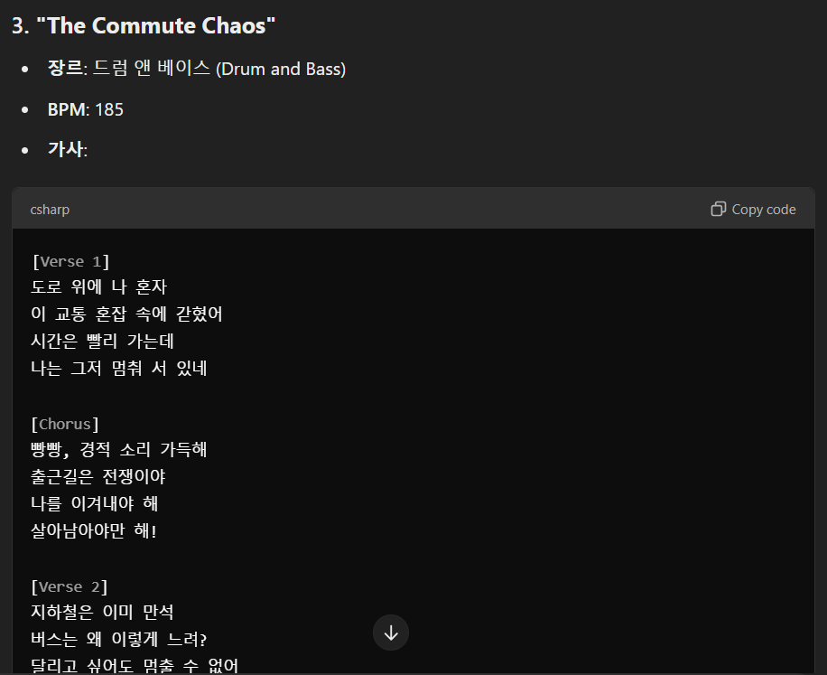 결과적으로 10곡의 앨범 제목, 노래 제목, 장르, 비트, 주제를 얻을 수 있었습니다. 이를 바탕으로 이제 가사를 만들어볼 텐데요. 각 곡의 길이는 2분 30초에서 3분 정도로 설정했습니다. 개인적으로 이 시간이 달리기 음악으로 적당하다고 생각했기 때문이죠.