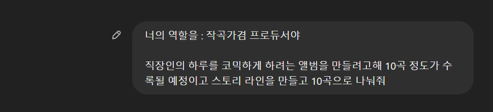 가장 처음 제가 넣은 프롬프트입니다. 아주 간단하죠 역할을 설정해 줬습니다. 이제부터 ChatGPT는 저의 충실한 작곡가 겸 프로튜서가 되었어요. 그리고 역할 설정 아래는 제가 원하는 내용입니다. 그럼 결과를 볼까요?