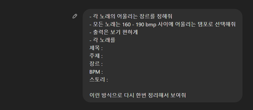 가사를 작성하기 전에 먼저 장르를 결정하는 것이 중요합니다. 그래야 ChatGPT가 장르에 맞는 가사를 만들어 줄 수 있으니까요. 저는 달리기 할 때 케이던스를 고려해 **BPM(분당 박자)**를 160-190 사이로 설정했습니다. 제가 원하는 케이던스가 180 정도이기 때문에 이죠.